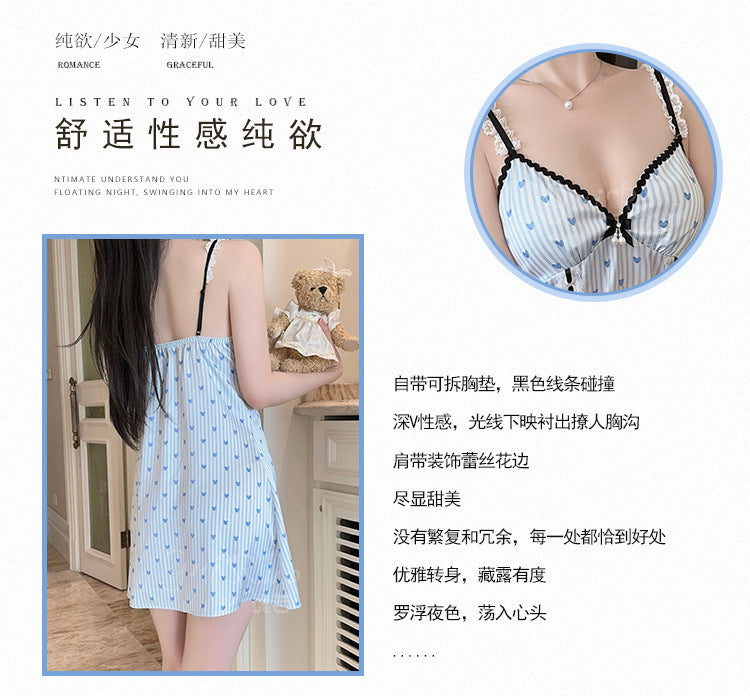 DZ Gorgeous Passionate Hot Smooth Ice Silk Pajamas Deep V Temptation Lazy Ladies Nightdress Set with Chest Pads5187